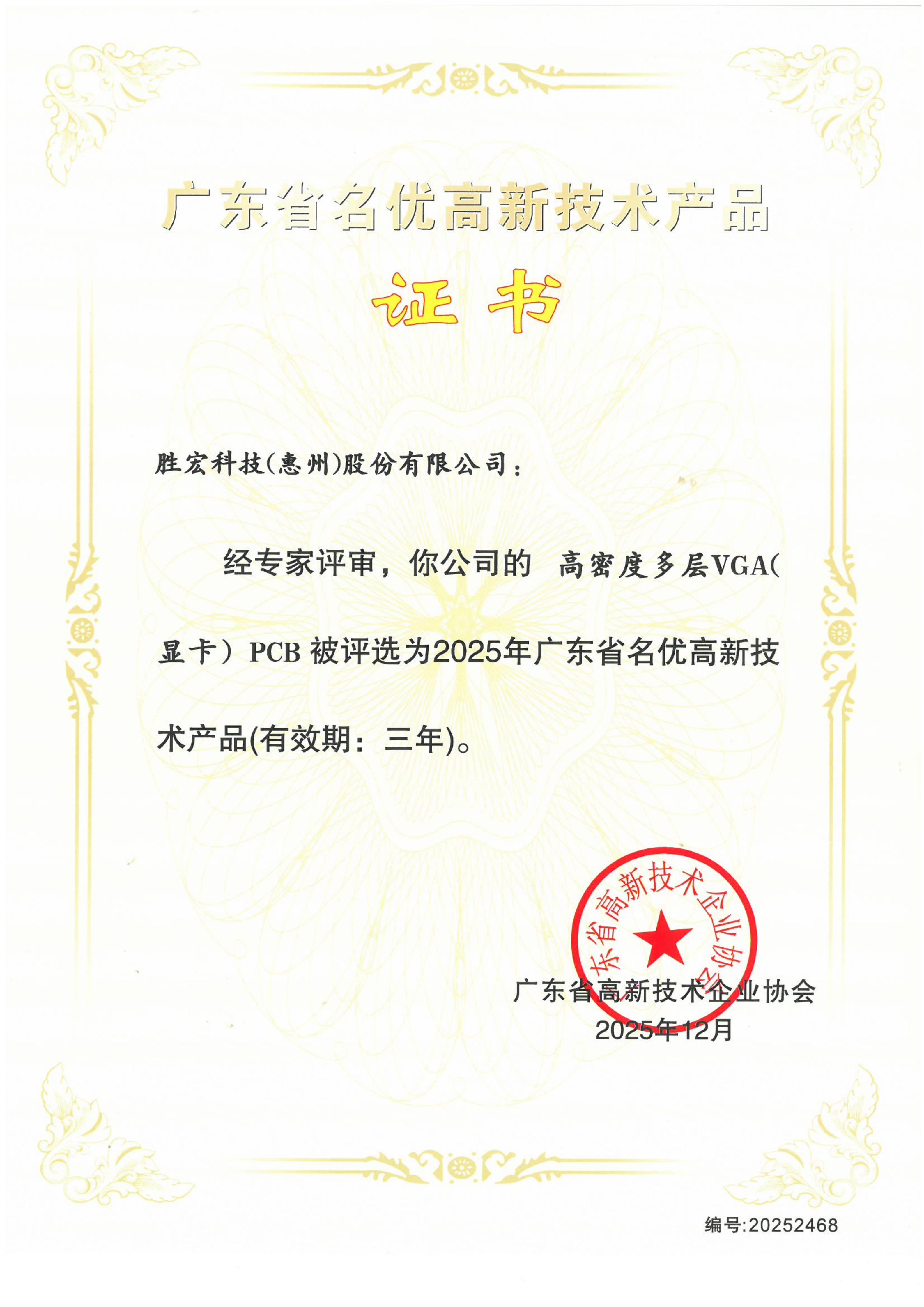 “高端高頻電路板”名優高新技術產品證書